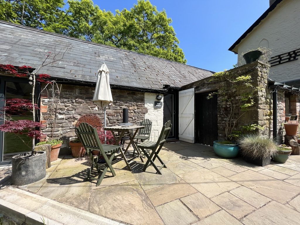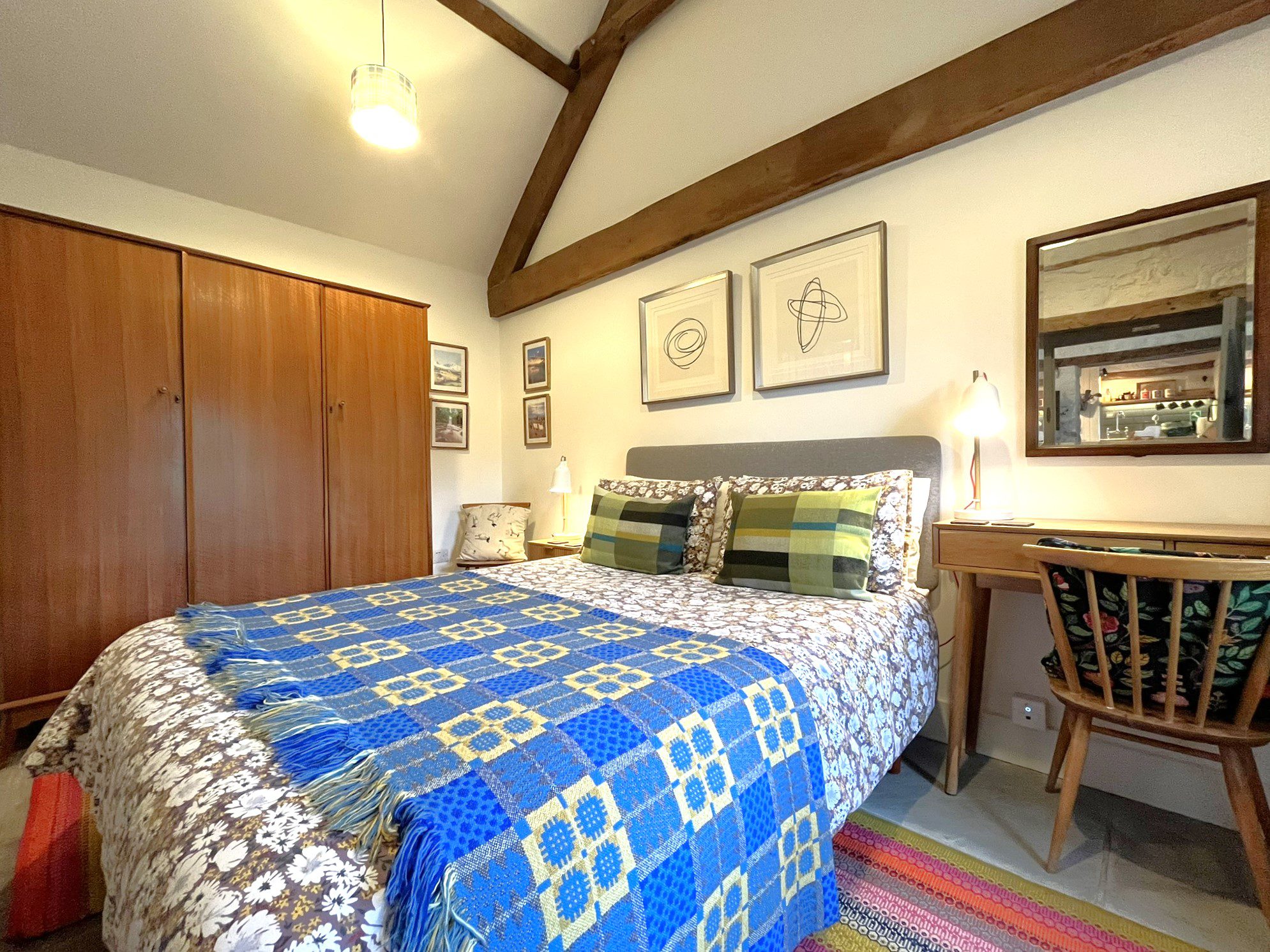 On the opposite side of the Living Room is a separate Bedroom with vaulted ceiling, double bed, large wardrobe and dressing table, and a further gothic arched window. The barn is heated by an air source heat pump and powered by solar panels.